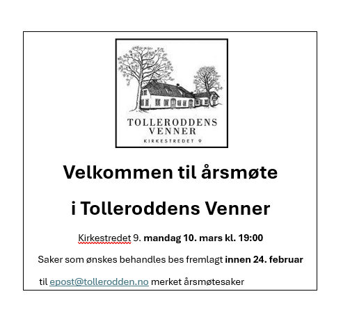 Velkommen til årsmøte i Tolleroddens Venner Kirkestredet 9. mandag 10. mars kl. 19:00 Saker som ønskes behandles bes fremlagt innen 24. februar til epost@tollerodden.no merket årsmøtesaker