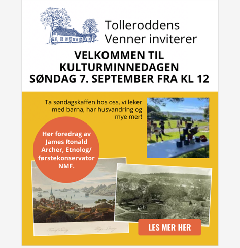 Tolleroddens Venner Inviterer: Velkommen til Kulturminnedagen Søndag 7. September fra kl. 12 Ta søndagskaffen hos oss, vi leker med barna, har hus vandring og mye mer. Hør foredrag av James Ronald Archer, Etnolog/førstekonservator NMF