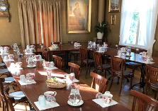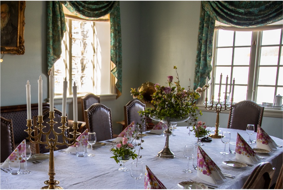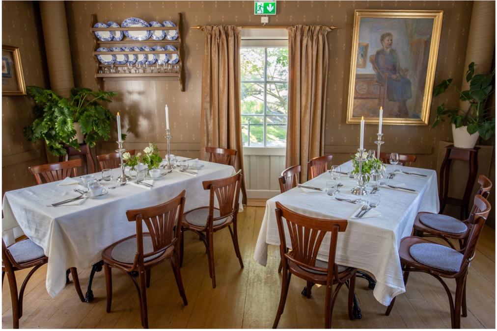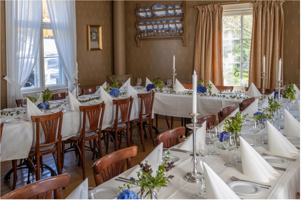 Vi dekker til maks 40 gjester i Marys spisestue. Eller for maks 22 gjester i Framsalongen. Kaffe serveres i de andre historiske stuene. Maten velger du i Tolleroddens Meny. Kaker kan etter avtale leveres til oss i forkant.